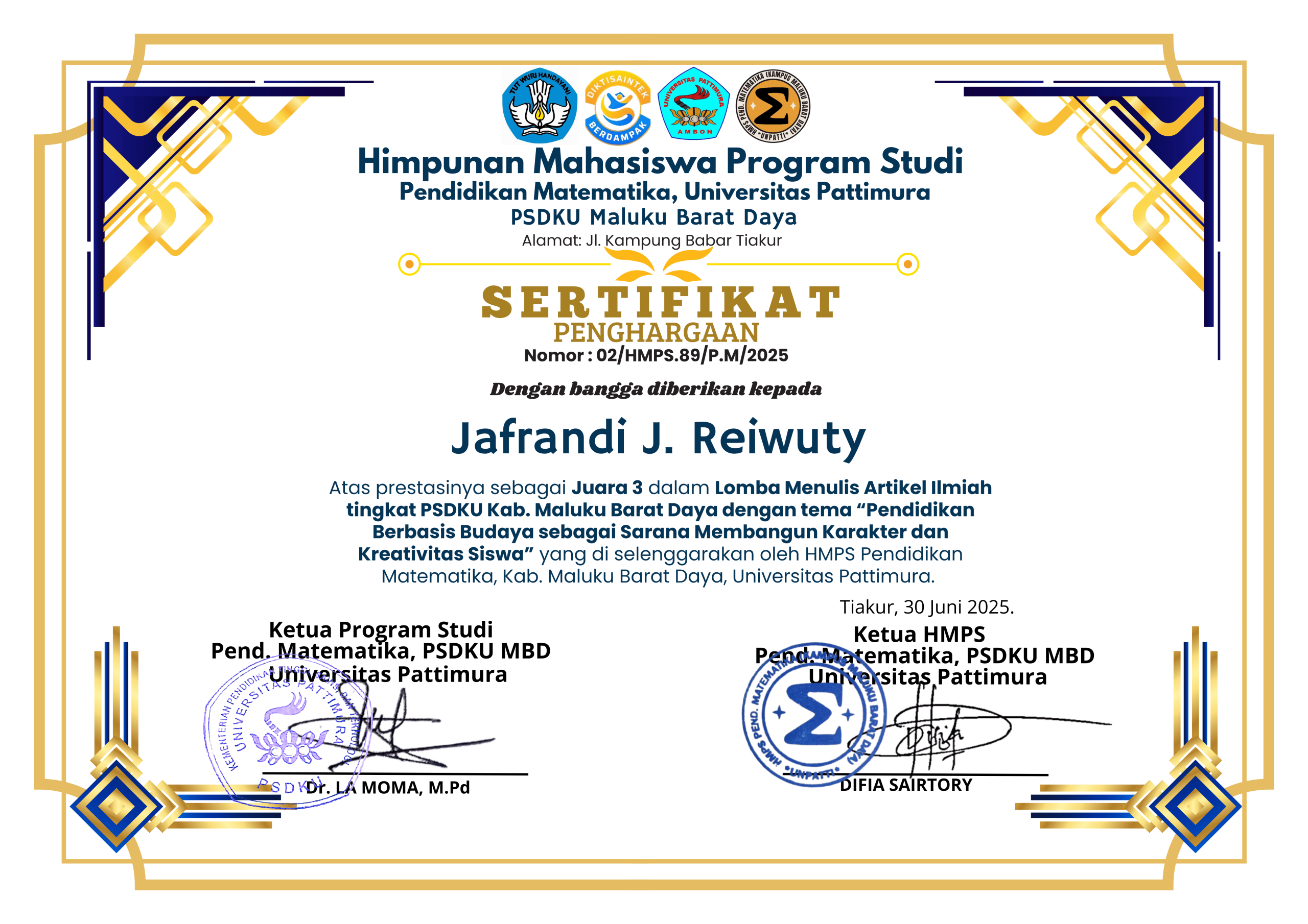 Jafrandi J. Reiwuty, Juara 3 Lomba Menulis Artikel Ilmiah tingkat PSDKU Kab. Maluku Barat Daya MatematikaSeptember 12, 2025 Facebook Twitter WhatsApp Pinterest