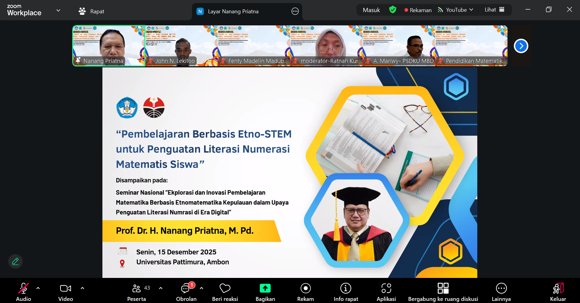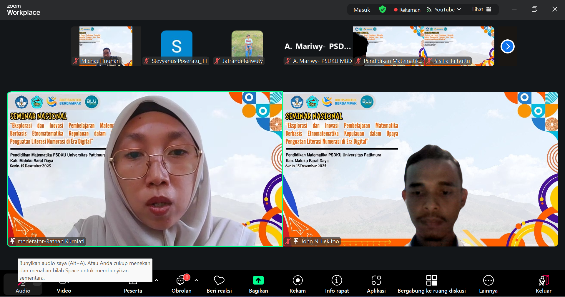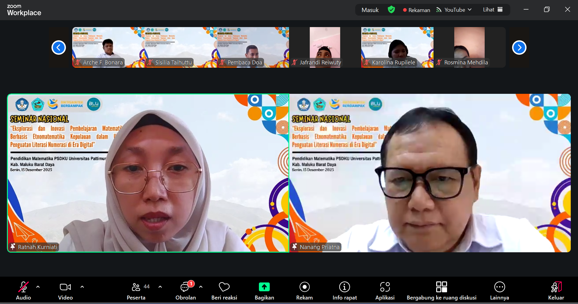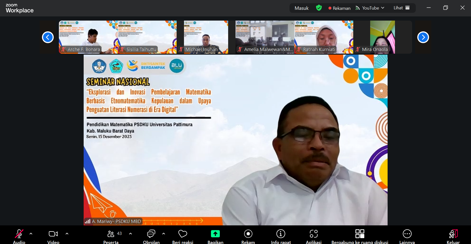 Program Studi Pendidikan Matematika PSDKU Universitas Pattimura di Kabupaten Maluku Barat Daya menyelenggarakan Seminar Nasional bertema “Eksplorasi dan Inovasi Pembelajaran Matematika Berbasis Etnomatematika Kepulauan dalam Upaya Penguatan Literasi Numerasi di Era Digital.” Kegiatan ini dilaksanakan secara daring melalui aplikasi Zoom pada Senin, 15 November 2025, mulai pukul 11.00 WIT hingga selesai. Seminar nasional ini diikuti oleh dosen, guru, dan mahasiswa dari berbagai wilayah. Kegiatan ini bertujuan untuk memperkuat pemahaman dan praktik pembelajaran matematika yang kontekstual, inovatif, serta berakar pada budaya lokal kepulauan.